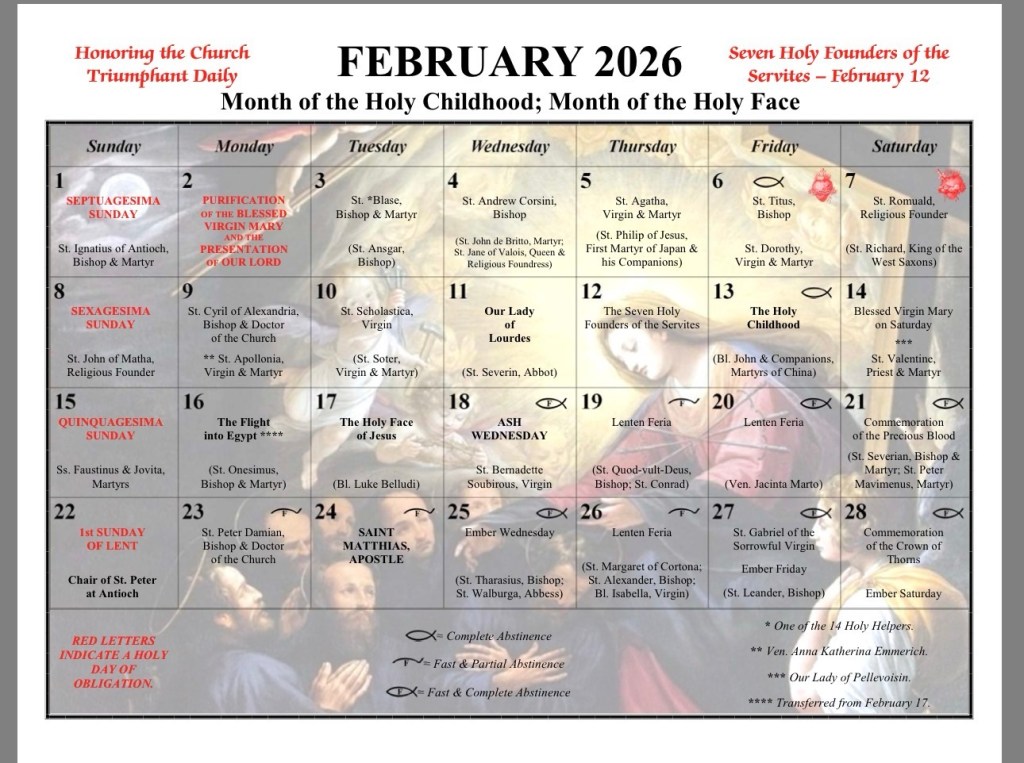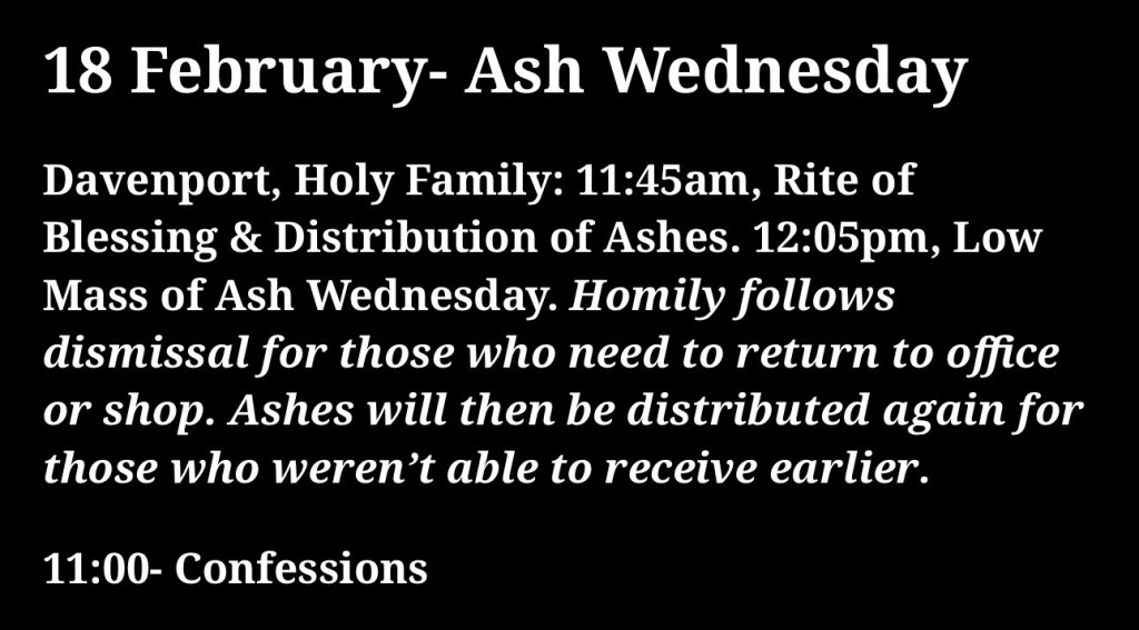 Davenport, Holy Family: High Mass, 11:00am. Confessions & Rosary before Mass; Holy Face devotion & Fellowship Meal in Hall after Mass