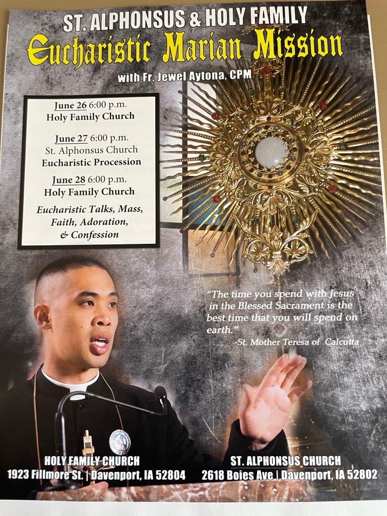 Eucharistic Marian Mission next week at Holy Family & St Alphonsus, Davenport Posted byfrcry2020June 21, 2023Posted inParish announcementsTags:Parish Events https://fathersofmercy.com/team-members/fr-jewel-aytona/ https://fathersofmercy.com/about-us-fom/ Share this: Click to share on X (Opens in new window) X Click to share on Facebook (Opens in new window) Facebook Like Loading... Published by frcry2020 Episcopal Delegate for and Chaplain to the pre-Conciliar Community of the Diocese of Davenport, USA View more posts