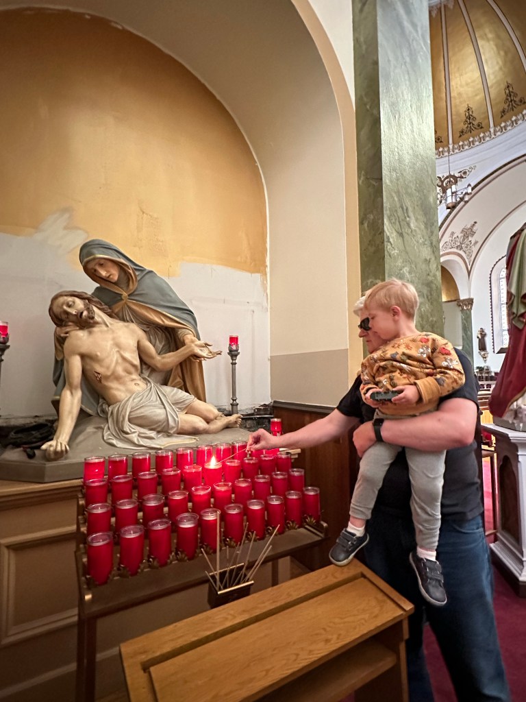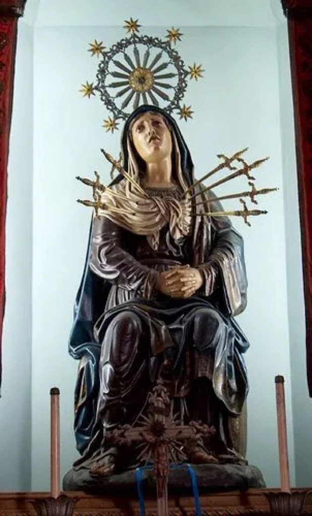 These seven sorrows are often represented in art by a sword — or three or seven swords — piercing Mary’s heart. This relates to the prophecy of the old man Simeon we heard about at Candlemas, when, after Our Lady pesented the Child Jesus at the Temple, he told her, “Behold this Child is set for the fall, and for the resurrection of many in Israel, and for a sign which shall be contradicted; And thy own soul a sword shall pierce, that, out of many hearts, thoughts may be revealed.”