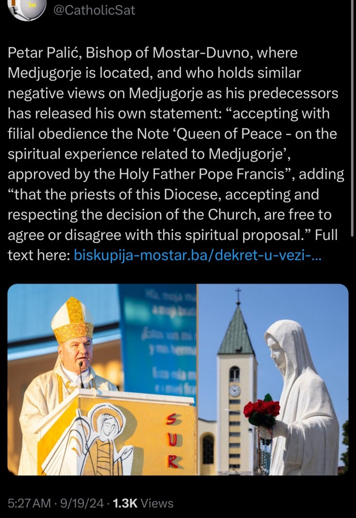 Dicastery for the Doctrine of the Faith today grants approval (Nihil obstat) for devotion linked to Medjugorje, specifying this “does not imply that the alleged supernatural events are declared authentic” nor that its messages “have a direct supernatural origin.” @dianemontagna