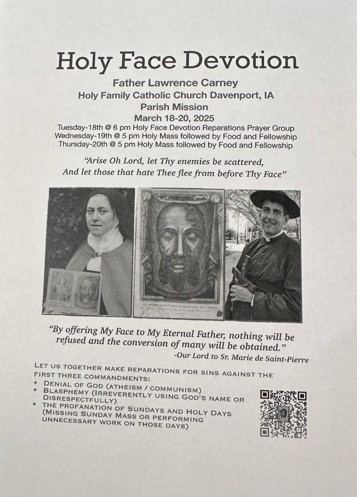 All are invited to the Holy Face prayer group on March 18th at 6 pm. Fr. Carney will be at the 5pm Holy Masses on March 19 & 20 followed by Mission Talks, foods and fellowship.