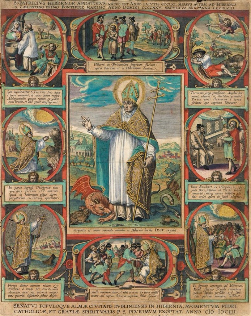 (This print, Scenes from the Life of St. Patrick) by Flemish engraver Adriaen Collaert (1560-1618) was published in 1603)