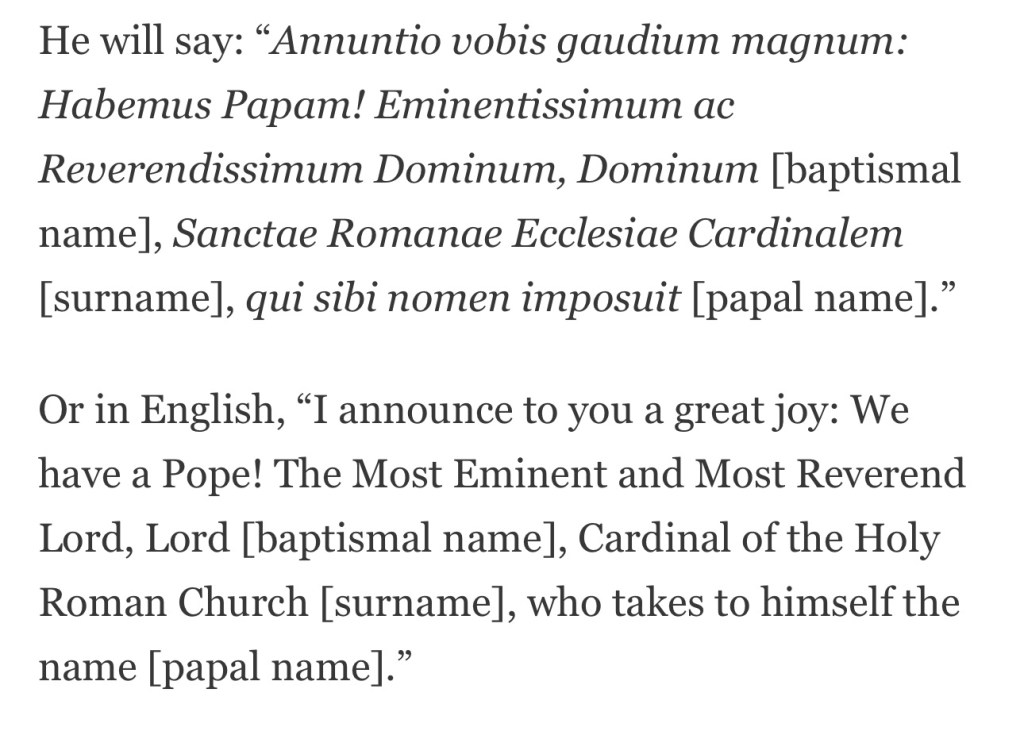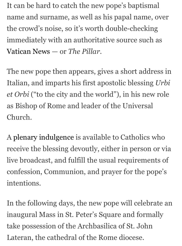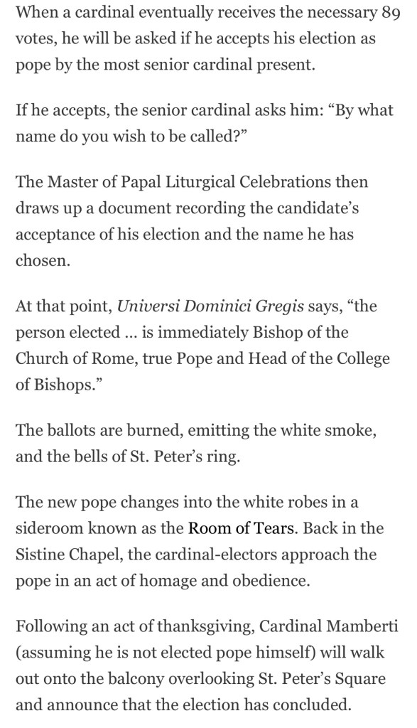 A newly elected pope has received 89 ballots from the Cardinal electors- then what happens? Posted byfrcry2020May 7, 2025May 7, 2025Posted inInstruction https://www.pillarcatholic.com/p/whats-happening-when-a-conclave-watchers Share this: Click to share on X (Opens in new window) X Click to share on Facebook (Opens in new window) Facebook Like Loading... Published by frcry2020 Episcopal Delegate for and Chaplain to the pre-Conciliar Community of the Diocese of Davenport, USA View more posts