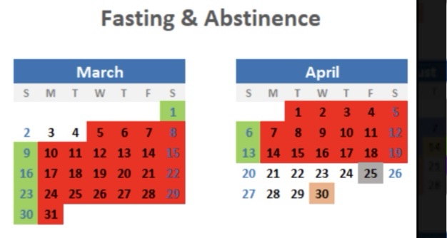 Obligatory Fasting and Abstinence Lent 2025…according to the requirements for Catholics the year our Missal was promulgated, 1962 (in red and grey. Previous required fasting days indicated in green)