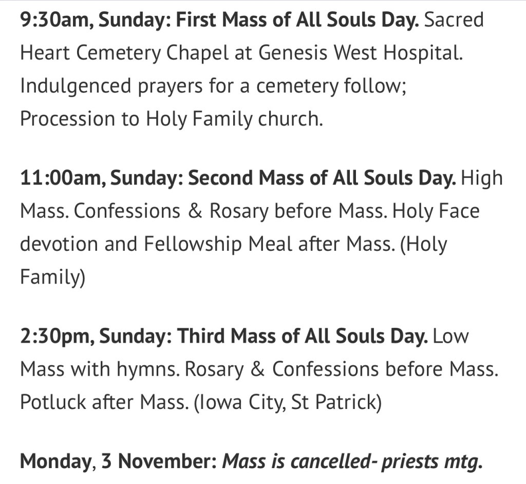 9:30- Confessions & Rosary. Children may wear saints costumes during Mass. Fellowship Brunch in Hall after Mass. Bring some food- or bring some cash.